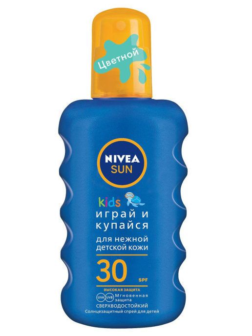 Детский солнцезащитный ЦВЕТНОЙ (цвет исчезает через несколько секунд после нанесения) спрей Играй и купайся SPF 30 от Nivea Sun KIDS с высоким фактором защиты специально для нежной детской кожи.