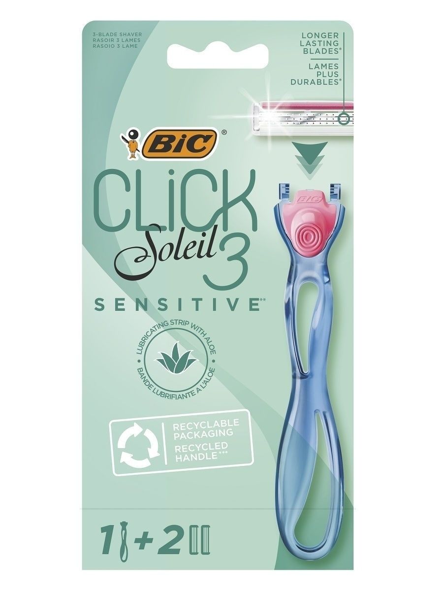 В комплект женской бритвенной системы BIC Click 3 Soleil Sensitive входит ручка, изготовленная на 30% из переработанного пластика, и 2 сменные кассеты, которые можно заменить лёгким нажатием кнопки.